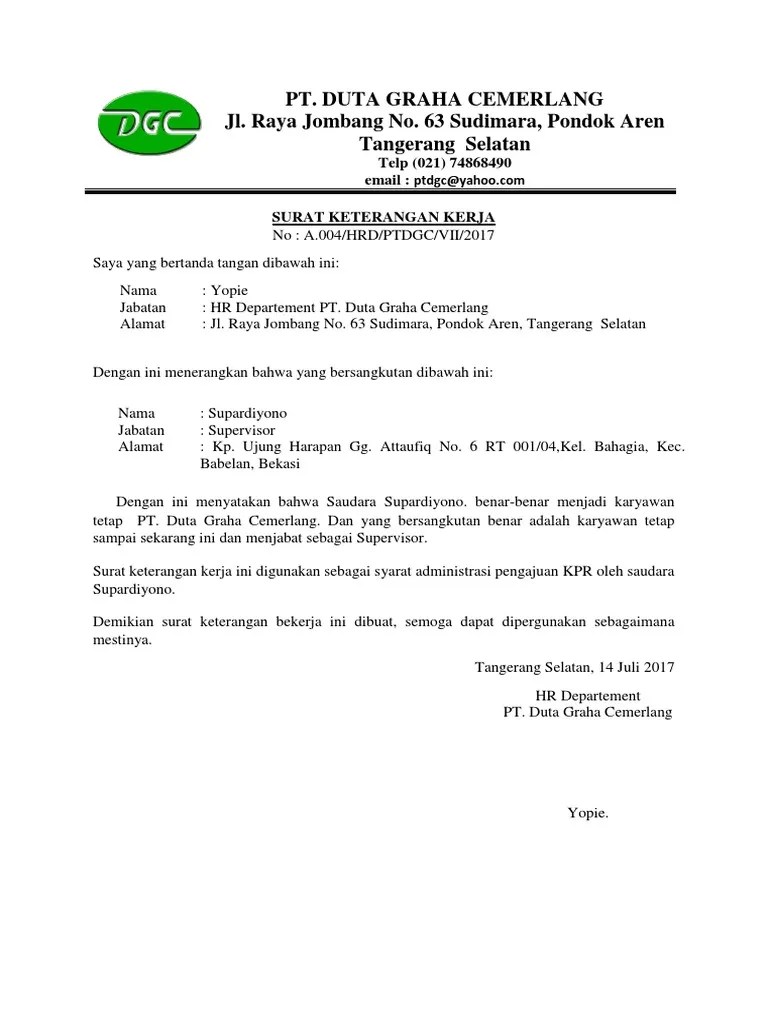 Format baru contoh surat pengalaman kerja dari perusahaan swasta.